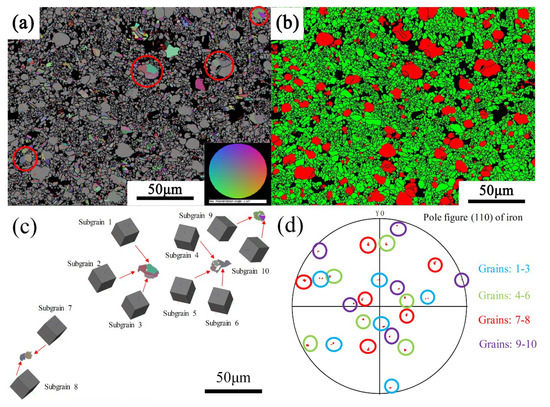 In addition, although the thermal stress was significantly reduced in the B3 and B4 samples, it can be seen from Figure 9 that a number of low-angle grain boundaries are still present inside the iron particles. Moreover, the iron particles marked by a red circle in Figure 11a contain two or more subgrains. It is inferred that this is caused by nucleation of the grain boundary which was in the metal phase. In order to prove the conclusion, the orientation of these crystals was analyzed, as shown in Figure 11c. The results indicated that the subgrains contained in each iron particle have the same orientation. To further prove this conclusion, the corresponding crystal planes were plotted in stereographic projections, as shown in Figure 11d. The marked planes indicate the parallel planes between the subgrains.