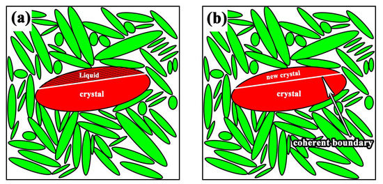 Since the crystal lattice of the core and parent crystal match perfectly, the interface between the core and the crystal is partially or completely coherent, so that the nucleation energy can be further reduced [34,35]. Figure 12 is the schematic diagram of grain boundary nucleation. The “crystal” in Figure 12a is a crystal that has grown, and its lower surface is in contact with the ceramic phase, and exhibits a round crown interface due to poor wettability. The interface between the newly formed core on the upper surface and the crystal is coherent. Thus, the shape of the surface is straight, which is a low-energy interface. With time, atoms in the liquid phase continue to accumulate at the interface, the crystals keep growing and gradually form new crystals named “new crystal”, as shown in Figure 12b. Hence, an iron particle is composed of two or more crystals with the same orientation, and all the grain boundaries are straight.