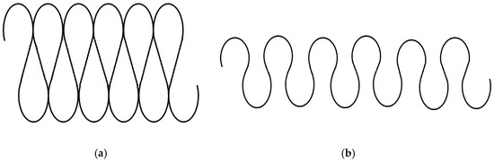 There are many changes in properties when a knitted fabric-based stretch sensor is extended. Previous researches [16,17,18] have shown that one interesting effect of stretching a fabric is that it increases its electrical resistance along the conductive thread. This is caused by opening up the stitch and so breaking the parallel contact points, making it necessary for the current to travel in series rather than in parallel. This increase in conductive path leads to greater resistance [17,19,20] as shown in Figure 1.