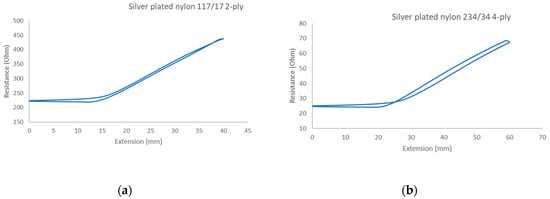 In the last decade there has been an increasing interest for developing different types of wearable sensors. There are many sensor types that have shown potential as wearable sensors amongst them piezoresistive films which show good change in resistance by simple changes to their geometry and observed microcracking contributing to high gauge factors [1,2]; although their durability and strechability are areas of concern for further development. Capacitive sensors are another common type seeing in touch screens because of their good sensitivity, low energy and adaptability [3]. They have however mainly being used for pressure because they suffer from environmental noise and hence difficult for use in wearable applications. Textile-based sensors are desirable for wearable end users [4,5] because they are comfortable, flexible, and not obstructive to the wearer’s everyday activities. A textile sensor can be designed and presented in numerous types and forms. One particularly interesting type is as a strain resistance sensor, which is achieved by the alteration of the mechanical properties of the material under stress/strain deformation, whilst its flexibility allow care of wrapping of the body of the wearer. Textile strain sensors can detect stretch, displacement, and force resulting from large movement of joint bending [6] or small body movements such as breathing [7]. Many studies have investigated theoretical and practical relationships between the electrical resistance and elongation of conductive fabrics [8,9,10]. Thomson and Kelvin [11] found that the resistance changes of a conductor were affected by stretching. Zhang et al. [12,13] and Li et al. [14] showed that the electrical resistance occurring between overlapping knitted loops is a major factor contributing to the overall resistance. Likewise, Ehrmann et al. [15] found that different yarns, stitch dimensions, and different fabric directions affect the elongation and time-dependent resistance behavior of the sensor.