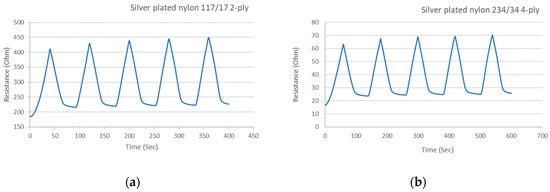 Resistance against extension and resistance against time in different type of silver plated nylon conductive thread: (a) 117/17 2-ply and (b) 234/34 4-ply.