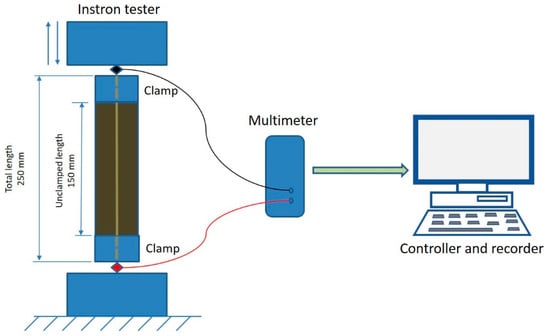 Figure 6 shows the experimental apparatus and set up. The sensor samples are clamped between the jaws of an Instron 3345 Tensile Tester and the two ends of the sensor are connected to a digital millimeter (DMM Agilent U1273A/U1273AX, Agilent Technologies Inc., Santa Clara, CA, USA). Installing the Agilent GUI Data Logger software on a PC is used to record the electrical resistance response to extension and recovery cycles, at a sampling rate of approximately 1 Hz. The jaws were electrically isolated from the fabric sensor with a layer of synthetic polymer rubber, so that only the resistance of the sensor itself would be measured by the millimeter. The jaws were set 150 mm apart and 250 mm long in the sensor direction (50 mm is needed at either side of the sample for clamping).