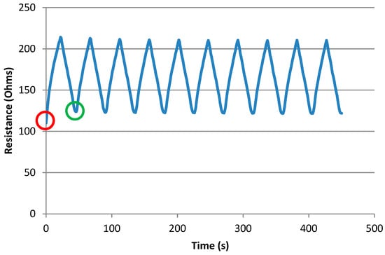 Note that the unstretched resistance in the first cycle (circled in red) is significantly lower than that of subsequent cycles, where it becomes stable. Therefore, the first cycle of each sample is not included in the data. Hence, for end use measurements it is advisable that sensors are pre-stretched in order to normalize the data, this was also observed by others [17,19]. In our experiments from now on, only data from the second cycle onwards is being used (circled in green).