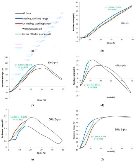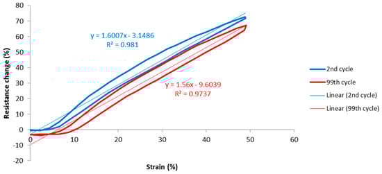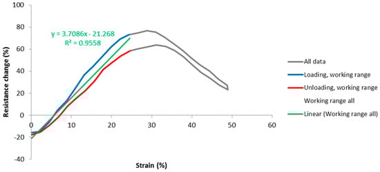 where and are the unstretched resistance and length, respectively; and are the changes in resistance and length due to stretching, respectively; and is the strain. The gauge factor is unitless and is calculated by taking the gradient of lines of best fit on a graph of resistance change vs. strain. For example, the line of best fit in Figure 5 follows equation y = 0.0025x + 0.2065, so its gauge factor is 0.0025. The ideal sensor would have a high gauge factor (high sensitivity), so that changes in resistance are large in relation to strain changes. This would make it easy to detect a small change in strain because these would show as a large change in resistance. If the sensor shows very small changes in resistance in relation to changes in strain (i.e., a resistance vs. strain graph showing a horizontal strain line), it makes it very difficult to accurately measure small changes in strain, hence leading to poor sensor performance.