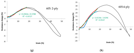 Graphs of percentage resistance change vs. strain, assembly averages over the 2nd to 11th cycles. (a) Legend for all graphs; (b) 304: 2-ply; (c) 406: 2-ply; (d) 406: 4-ply; (e) 506: 2-ply; (f) 506: 4-ply; (g) 605: 2-ply; and (h) 605: 4-ply. Note the different vertical axis scales. 2-ply is thread 117/17, 33 tex and 4-ply is thread 235/34, 92 tex.