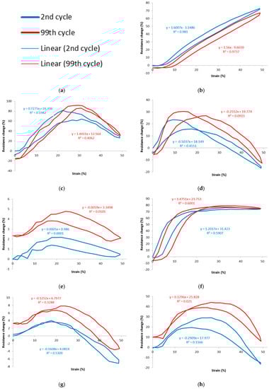 Graphs of percentage resistance change vs. strain, for the 2nd and 99th cycles. (a) Legend for all graphs; (b) 304: 2-ply; (c) 406: 2-ply; (d) 406: 4-ply; (e) 506: 2-ply; (f) 506: 4-ply; (g) 605: 2-ply; and (h) 605: 4-ply. Note the different vertical axis scales. 2-ply is thread 117/17, 33 tex and 4- ply is thread 235/34, 92 tex.