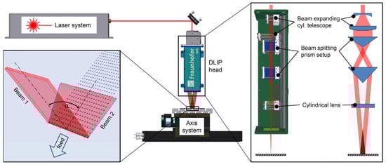 A promising method for producing these micro and nanostructures in a cost-efficient way is direct laser interference patterning (DLIP) [31,32,33]. In DLIP, two or more laser beams are overlapped on the surface of the substrate, creating a periodic intensity distribution. The pattern consists of a high number of high intensity elements (interference maxima) which are produced with a single laser shot.