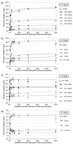 Evolution of the heights of trench patterns produced with DLIP: (a) Λ= 19.0 µm, variation of PO at fixed rep. rate frep = 2 kHz, (b) Λ= 19.0 µm, variation of rep. rate at fixed PO of 98%, (c) Λ= 8.0 µm, variation of PO at a fixed rep. rate frep = 0.1 kHz, and (d) Λ= 8.0 µm, variation of pulse repetition rate at fixed PO of 98%. Material: aluminum AlMg3. The laser fluence per pulse was 3.2 J∙cm−2.