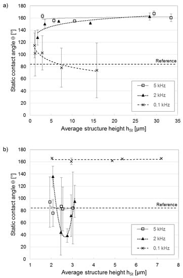 As can be seen, for the large interference period Λ = 19.0 µm (Figure 7a), considerable high water contact angles (even over 150°) were measured for samples that were treated using pulse repetition rates of 2 kHz and 5 kHz. For example, for the line-like patterns produced at a 2 kHz repetition rate, the contact angles increased slightly with increasing structure height, from 128° at hSt = 2.3 µm up to ~160° at hSt = 28.0 µm. For patterns produced with 5 kHz, the measured CAs were slightly higher compared to the structure produced at 2 kHz. For the patterns produced with a pulse repetition rate of 0.1 kHz, the contact angle decreased significantly with increasing structure height from 115° at hSt = 0.9 µm down to ~75° for hSt = 16.9 µm.