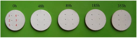 For aging times from 48 to 185 h, the ceramic edges in the area of erosion were irregular, and their diameters were 0.76, 1, and 1.05 mm, respectively. The largest diameter of the removed ceramic fragment was observed in the sample subjected to aging for 353 h, and it was approximately 2.06 mm.