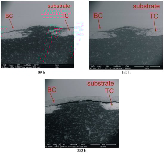 Upon further observation of the impact area at 400× magnification, three patterns of crack formation could be distinguished depending on the aging time. These three patterns concerned the crack path in relation to the BC/TC interface at which the thermally-grown oxide (TGO) layer grew due to high temperature and the presence of oxygen (Figure 4).