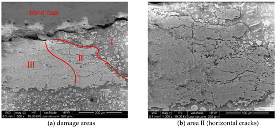 Area II—The presence of numerous horizontal cracks. This area was very narrow near the BC interface and expanded with increasing TC height,