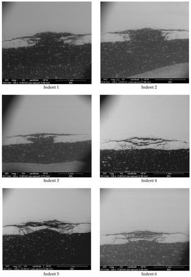 After making indents, two cross-section cuts were made in each sample by the section method. Then, the samples were subjected to grinding and polishing. Afterwards, the samples were macroscopically examined with a Quanta FEG 250 (Thermo Fisher Scientific, Hillsboro, OR, USA) scanning electron microscope.