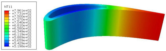 Numerical simulations of foreign object impact were performed for two variants: cold and heated blades. In the heated blade variant, a coupled temperature–displacement step was used. The outer surface of the blade was described with the sink temperature of 800 °C and the surface film condition of 300 W/m2K, while the channel surface cooling was described with the sink temperature of 20 °C and the surface film condition of 150 W/m2K. In this variant, the steady-state process was considered to obtain the temperature distribution shown in Figure 7.