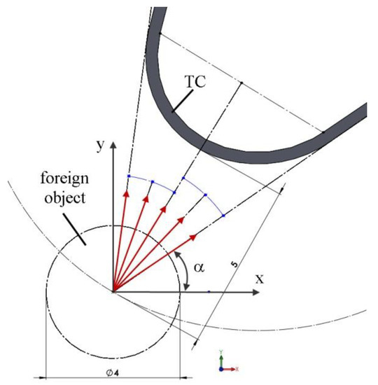 For the FOD calculations in Abaqus, the dynamic/explicit step type was selected. The simulation duration was set equal to 0.0005 s. In every tested variant, the initial speed of a foreign object (i.e., a ball with 4 mm diameter) was kept constant at 74.84 m/s. This value was used for the first indent in the experiments. Five angles of foreign object incidence were analyzed, as shown in Figure 8. All degrees of freedom were taken away from the lower part of the blade.