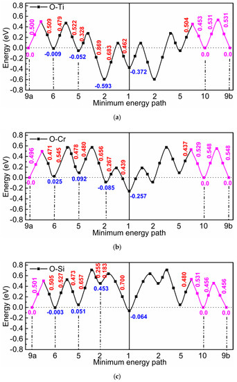Migration barriers for oxygen in the environment of Ti (a), Cr (b), and Si (c). The red and blue numbers show the barrier height and the binding energy, respectively. The magenta lines and numbers show modifications of the original Density-Functional-Theory (DFT) data according to the rule of detailed balance (see text).