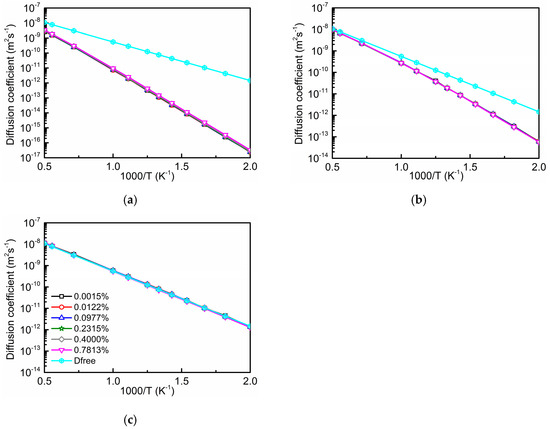 Data for the total diffusion coefficient of oxygen in different dilute alloys are depicted in Figure 6. They were calculated using four different methods: (i) by full AKMC simulations as in Reference [2], (ii) by Equations (1) and (2), i.e., with , and from AKMC simulations, (iii) by Equations (1)–(3), i.e., with a concentration-independent value of from AKMC simulations (taken from Figure 3 for the concentration of 0.0977%), and (iv) using the equation