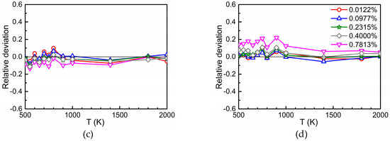 Relative deviation for different values of in the case of Ti (a), Cr (b), and Si (c) in dependence on temperature ( = 0.0015%). If the interaction region between oxygen and Ti is reduced to the 5th neighbor shell the deviations become smaller (d).