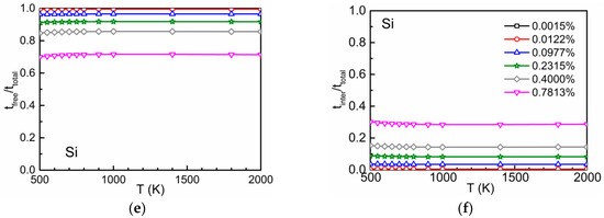 The time ratios and according to Equation (3) are shown in Figure 5. Due to the attraction between oxygen and Ti and between oxygen and Cr at the first- and second-neighbor distances, at low temperatures the residence time of the diffusing atom in the interaction region is relatively high [2]. This leads to high values for and low values for . The opposite behavior is found at high temperatures. The higher the concentration of the substitutional solute the lower (higher) are the values of () at a given temperature. On the other hand, the interaction between oxygen and Si is repulsive and weakly attractive. Therefore, () is low (high) within the whole temperature range.