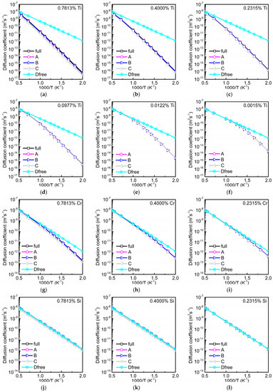 Total diffusion coefficient of oxygen in dependence on temperature and solute concentration obtained by different calculation methods. Curves marked by ‘full’ show results from full atomistic kinetic Monte Carlo (AKMC) simulations [2]. ‘A’ denotes the data determined by Equations (1) and (2) with the time ratios and from AKMC simulations for the respective concentrations . Data determined by Equations (1)–(3) with from AKMC simulations are marked by ‘B’, while results from Equation (4) with from Equation (3) are denoted by ‘C’. The diffusion coefficient of oxygen in pure bcc Fe () is plotted as reference. For Cr or Si below 0.2315% the difference between and is very small. Therefore, these data are not shown. Results for Ti (a–f), for Cr (g–i), and for Si (j–l).