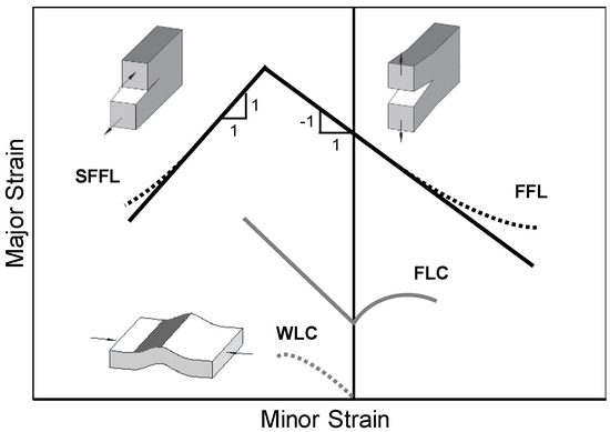 The fracture forming limit line (FFL) defines failure by fracture in mode I, and is plotted as a straight line falling from left to right with a slope of ‘−1’ in principal strain space. The physics of the FFL is the condition of maximum admissible thickness reduction at fracture [4]. The shear fracture forming limit line (SFFL) defines failure by fracture in mode II, and is plotted as a straight line rising from left to right with a slope of ‘+1’ in principal strain space. The physics of the SFFL is the condition of maximum in-plane shear work per unit of volume, as it was recently shown by Isik et al. [5]. Figure 1 illustrates the typical locations of the FFL and SFFL in principal strain space.