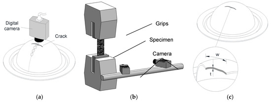 Schematic representation of (a) the computerised digital camera measuring system, (b) the digital image correlation system (DIC) and (c) the thickness measurements at the crack.