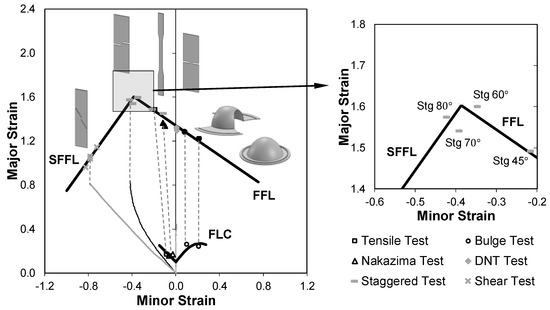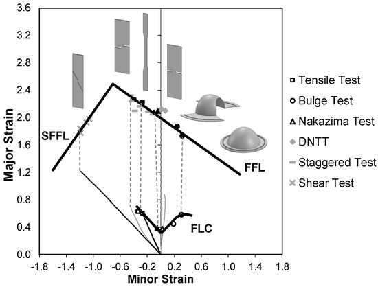 Figure 5 presents the formability limits and the corresponding failure strains for the aluminium AA1050-H111. The strain paths for the DNTT, staggered DNTT and shear tests were obtained by means of the DIC system, and all the fracture strain pairs were determined from measurements of the final thickness of the specimens after testing (Section 2.2).