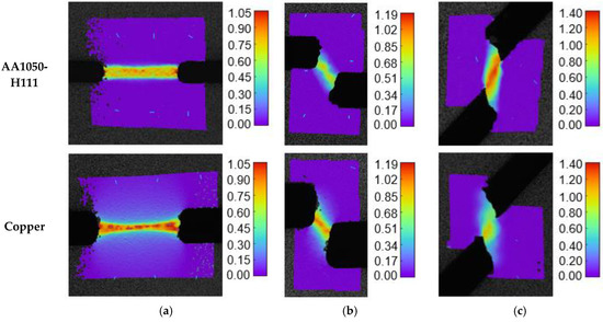 As seen in Figure 10a, the plastic deformation region of DNTT specimens of copper is wider than that of aluminium AA1050-H111, and a similar conclusion may be drawn for the staggered DNTT (Figure 10b) and shear (Figure 10c) test specimens. The consequence of the plastic deformation region being wider is two-fold. In one hand, it justifies the deviation of copper staggered DNTT specimens from pure shear conditions, because larger strain hardening coefficients diminish localisation effects, and therefore, reduce the absolute values of strains at the onset of fracture. This justifies the reason as to why copper staggered DNTT specimens could not provide fracture strains in the transition region between the FFL and SFFL in principal strain space.