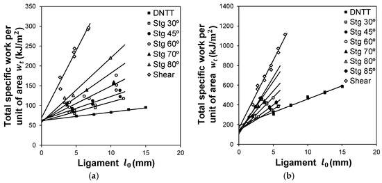 As seen, the evolutions are linear, and are in good agreement with the results obtained by Cotterell et al. [13], namely in what concerns the increase in the slope of the linear fitting of the total specific work with the specimen’s ligament angle . This means that the slope of the total specific work increases from the DNTT specimens ( = 0°, mode I) to the shear specimens ( = 90°, mode II).