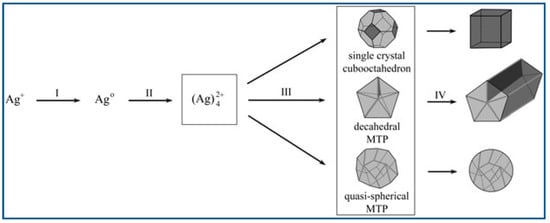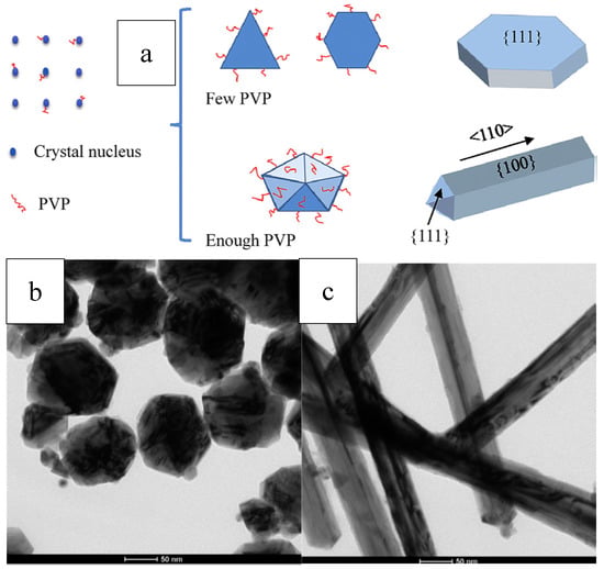 Polyol method has already been developed successfully to synthesize well-defined nanocrystals. Xia and co-workers successfully produced different Ag nanocrystals such as cube, rod/wire, and summarized three typical nanostructures of them produced via the route of polyol process mediated by PVP, as shown in Figure 4 [].