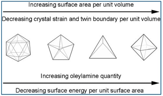 Niu et al. reported an OAm-based reaction for shape-controlled synthesis of Pd nanocrystals, and deca-like, icosa-like, octa-like, triangular platelike, and tetrahedral shaped nanocrystals were synthesized selectively by changing the amount of OAm. Typically, a certain amount of [Pd(acac)2], formaldehyde, toluene, and OAm were mixed and stirred at ambient temperature and atmosphere, followed by heated at 100 °C for 8 h in autoclave, and then slowly cooled to room temperature. Nanocrystals were formed via three steps: intermediates generation, nucleation formation, and crystal growth. The intermediates generation facilitates the manipulation of the reduction kinetics. The separation between nucleation and crystal growth provides precise control over the morphology and structure. OAm played very important roles during the shape evolution of Pd nanocrystals. The surface energy of the nanocrystals was dramatically reduced with the amount of OAm increased, because more surfaces were covered by surfactant. Therefore, multiple-twinned nanocrystals with low ratio of surface-to-volume evolved into single nanocrystals with high ratio of surface-to-volume []. To get better understanding of the Pd nanocrystal’s evolution in morphology, researchers employed a correlative thermodynamic model as a qualitative analysis means. Figure 5 shows the illustration of OAm mediated nanocrystal shape evolution [].