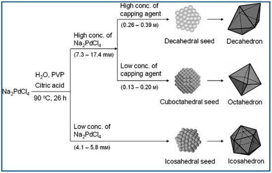 Lim et al. reported controlled synthesis of Pd nanocrystals of various shape via reduction of Pd salts from their aqueous solution using citric acid as reducing agent. Typically, Na2PdCl4, citric acid, and PVP were dissolved in distilled water, and the aqueous solution was heated to 90 °C and kept at that temperature for 26 h. Na2PdCl4 was the metal precursor, citric acid served as not only reducing agent but also capping agent, and PVP was used as stabilizer. It was demonstrated citric acid was conducive to the generation of octahedral, icosahedral or decahedral structures enclosed by {111} surfaces, and the Pd nanocrystal shape varied dependent on the Pd precursor concentration and citric acid concentration. Icosahedral seeds can retain the small state for long time at low concentration of precursor, because the generation of Pd atoms and the diffusion of generated Pd to the icosahedral seeds was the slow. Therefore, icosahedra would predominate the final products when the precursor concentration was low and reaction and crystallization were slow. With the precursor concentration increased, however, Pd atoms generated fast, and decahedron and cuboctahedron would predominate the seeds due to their grown particle size. Figure 6 presents the reaction pathways leading to structure controlled Pd nanocrystals [].