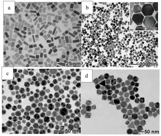 Single-crystalline Au nanocrystals with different shape (a). nanorods; (b). rhombic dodecahedra; (c). cubic nanocrystals; (d). octahedral nanocrystals). Reproduced with permission []. Copyright 2009, American Chemical Society.