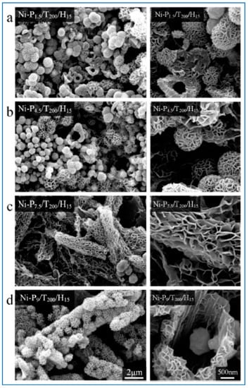 Literature reports and our experimental results showed that using sodium hypophosphite or sodium borohydride as reductant, it is easy to obtain fine nickel powder with good sphericity []. However, the products obtained are Ni-P and Ni-B alloys rather than pure metal nickel powders. Their reaction processes are shown in Formulas (14) and (15) []: