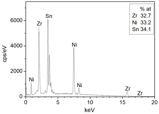 The ZrNiSn alloy was prepared from high purity components by arc melting, under Ar atmosphere. The alloy was re-melted five times, and the composition and homogeneity were verified by scanning electron microscopy (SEM, JSM5600, JEOL Ltd., Tokyo, Japan) and energy dispersive spectroscopy (EDS, Thermo Fisher Scientific, Waltham, MA, USA), as shown in Figure 1. The measured stoichiometry by the EDS was Zr0.98Ni1.00Sn1.02. Figure 2 presents an X-ray diffractogram (XRD, Rigaku DMAX 2100 powder diffractometer, Tokyo, Japan) of the alloy, revealing its half-Heusler structure () and a small amount of residual Sn, as expected from the EDS quasi-quantitative chemical analysis.
