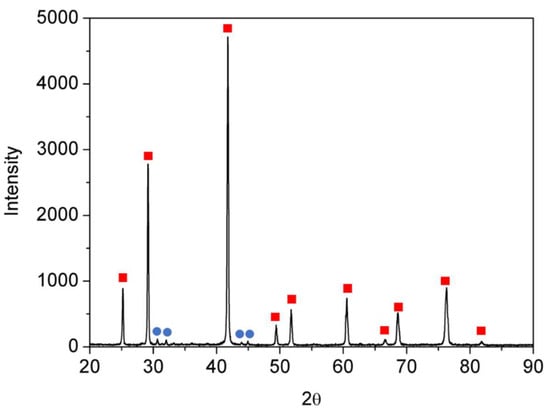 X-ray diffractogram (XRD) spectra of the synthesized sample. Red squares indicate the HH phase and the blue circles, the minority Sn phase.