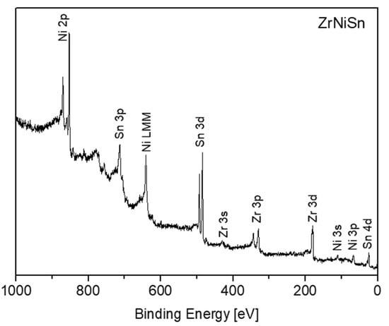 Survey XPS spectra of the ZrNiSn after sputter-cleaning at RT are presented in Figure 3. No measurable oxygen or carbon contamination could be observed. According to Graf et al. [3], in HH components having the general XYZ formula, the X and Y atoms are characterized by a cationic behavior, and the Z atom displays an anionic one. In the MNiSn family, where M denotes Ti, Zr or Hf, these elements and Ni are the cations, transferring charge towards the anionic Sn. This charge transfer tendency is expressed as chemical shifts of the elements in the alloy, compared to the known binding energy (BE) of the pure elements, as previously reported for the TiNiSn [11]. Table 1 depicts the measured BE of the elements from the clean ZrNiSn alloy. The values of the BE of the TiNiSn and the known common values of the pure elements from the literature are added for comparison. As can be seen, the Zr, Ti and Ni are shifted to higher BE, by 0.2–0.3 eV, while Sn is shifted to lower BE, in correspondence with the expected cationic and anionic behavior in the alloy.