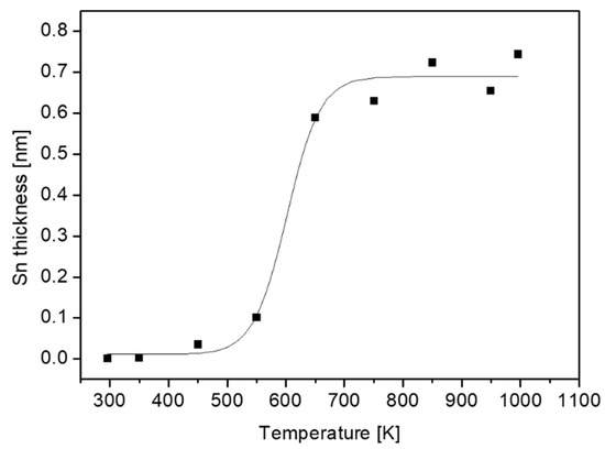 As can be seen from Equation (1), the layer thickness depends linearly on λ. However, there are no definite values for this parameter. IMFP, which is a function of electron energy and the material properties in which the electrons pass, is commonly evaluated by using the NIST database [19]. As for the previous report for TiNiSn, the results obtained from the predictive formula by Gries were adopted [11]. In order to follow the segregation dependence on temperature, the samples were heated to increasing temperatures for 15 min and monitored by XPS. The Sn layer thickness evaluated from Equation (1) by using the attenuation of the Zr signal by the Sn layer (λ = 2.1 nm) is depicted in Figure 5. Above 550 K, the segregation is vastly enhanced and the Sn overlayer reaches a thickness of about 0.7 nm.