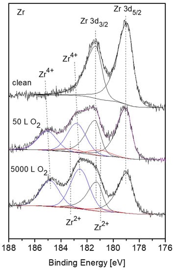 Representative XPS Zr 3d spectra, after different exposures at room temperature, with fitted metallic and oxide (Zr4+– blue, Zr2+– red) components.