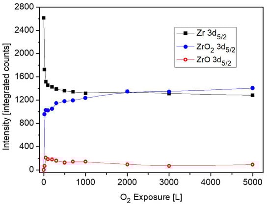 The metallic and oxides intensities of Zr vs. oxygen exposure at room temperature.