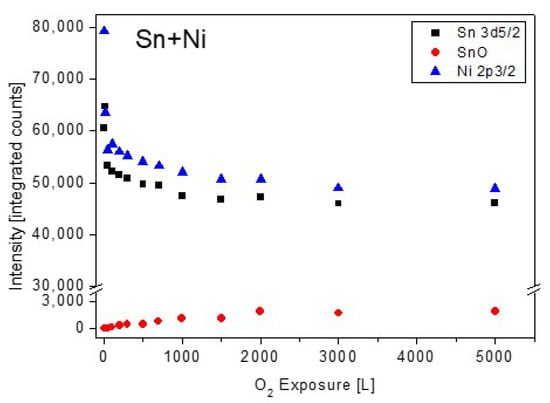 The metallic and oxides intensity of Sn and Ni vs. oxygen exposure at room temperature.