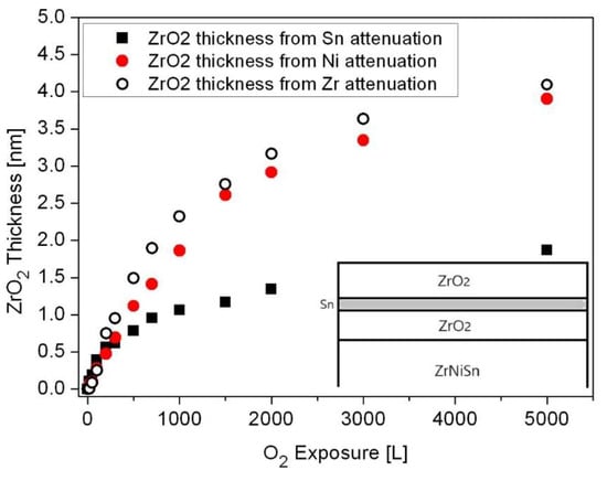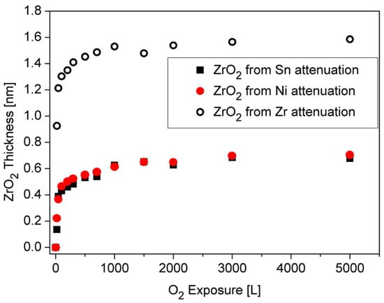ZrO2 thickness formed on the surface during oxygen exposure at RT, as calculated from the attenuation of the Sn, Ni and Zr signals.