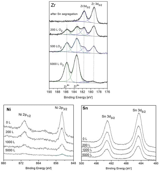 Previous to the exposure to oxygen at the elevated temperature, the sample was heated in vacuum at 1000 K for 15 min, to allow the Sn segregation to the surface. After each dose of oxygen, the oxygen was pumped out and the sample was cooled down prior to the XPS measurement. Representative XPS spectra of the alloy components during oxidation are presented in Figure 10. The spectra show rapid oxidation, almost disappearance of the metallic Zr signal at higher exposures and the formation of the Zr4+ oxidation state. During the fittings, the Zr2+ doublets were seemed to constantly cancel out, indicating that at the high temperatures this interlayer sub-oxide is not formed, or its amount is below the resolution or detection limit. Similar to RT, only minor oxidation of the Sn and no oxidation of the Ni can be seen, but the Sn signal attenuates significantly, and the Ni signal almost entirely disappears after 5000 L exposure.