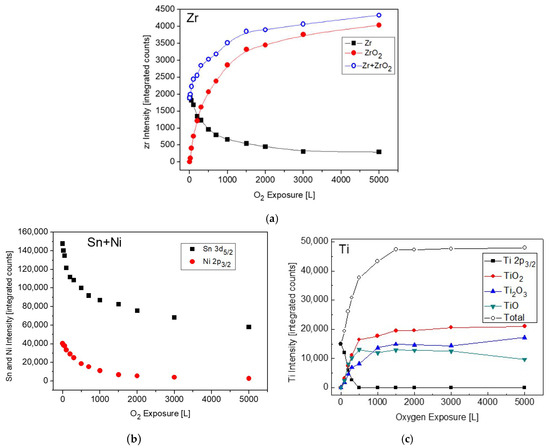 Intensity variation of: (a) Zr, ZrO2, (b) Ni and Sn and (c) Ti and its oxides, from [11] for comparison, during oxygen exposure at 1000 K.