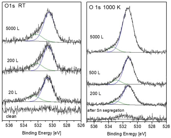 Representative O 1s spectra and peak fittings after oxygen exposure at RT and 1000 K.