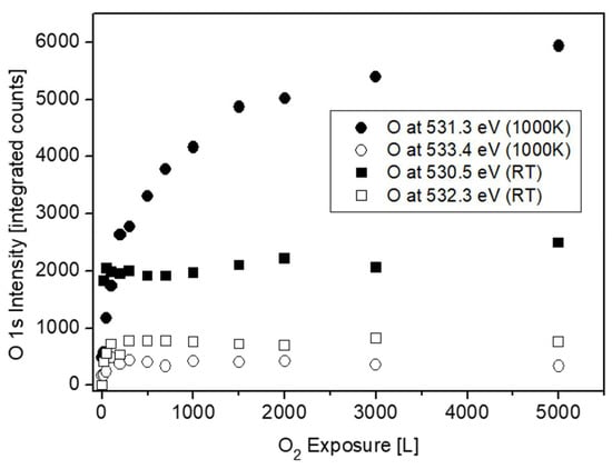 O 1s intensity vs. oxygen exposure at RT and 1000 K.