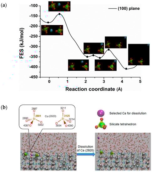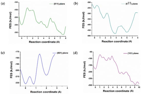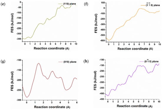 Contrariwise, the dissolution profile of calcium from (001) surface shows the opposite trend and supports the results that were predicted after 600 picoseconds of hydration (Figure 1b). The complete dissolution of Ca-1957 from (001) surface was required to overcome the barrier of 12.50 kJ/mol at 0.43 × 10−10 m and 50.00 kJ/mol at 20 × 10−10 m. The total free energy change (ΔG) of +14.00 kJ/mol at 298 K represents an endergonic reaction and is thermodynamically unfavorable [26,27]. This explains the reduced reactivity and water tessellation of the (001). Likewise, Ca dissolution from (010), (), (110), () surfaces required a very high activation barrier (Table 1), therefore, these surfaces are less reactive toward hydration, endergonic and thermodynamically not favorable.
