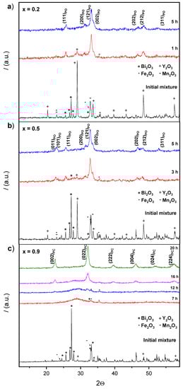 Evolution with the milling time of the stoichiometric mixture of reactants corresponding to Y1−xBixMn1−xFexO3 for compositions: (a) x = 0.2; (b) x = 0.5; and (c) x = 0.9 (PC—Pseudocubic Perovskite; PO—Pseudo-orthorhombic Perovskite).