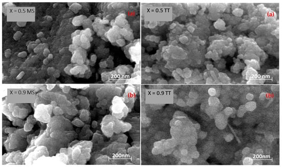 Regarding the obtained phases, a structural evolution with composition was found, from a pseudo-orthorhombic perovskite for low x values (e.g., Figure 1a), to a pseudo-cubic perovskite for high x values (e.g., Figure 1c). Specific symmetry in the latter case could not be identified from the XRD patterns of the mechanosynthesized oxides due to peak broadening, reflecting the small crystal size. This was revealed by the scanning electron microscopy studies: A micrograph of the mechanosynthesized powder with x = 0.5 and x = 0.9 is shown in Figure 2a, where submicron sized agglomerates of small particles with a particle size between 20 and 25 nm are observed. Significant differences in particle size with composition were not found.