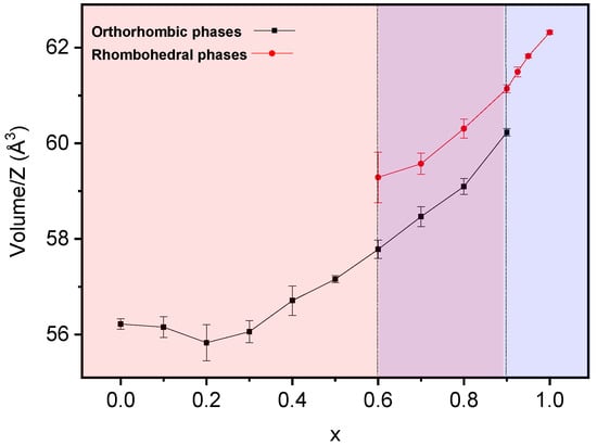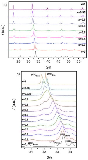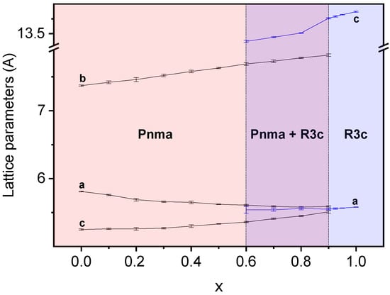 Lattice parameters as a function of the composition were obtained by the least-squares method for both perovskite phases. Results are summarized in Figure 4 and Table 1. Although coexistence of the orthorhombic Pnma (S.G. No. 62) and rhombohedral R3c h (S.G. No. 161) phases was observed in the range of 0.5 ≤ x ≤ 0.9, only one peak at 2θ ≈ 23° can be assigned to the rhombohedral phase in the diffraction pattern of the composition, x = 0.5, due to the low intensity and overlapping of signals. As a result, parameters for the R3c h phase could not be obtained for this composition. Trends for both polymorphs are given in Figure 4.